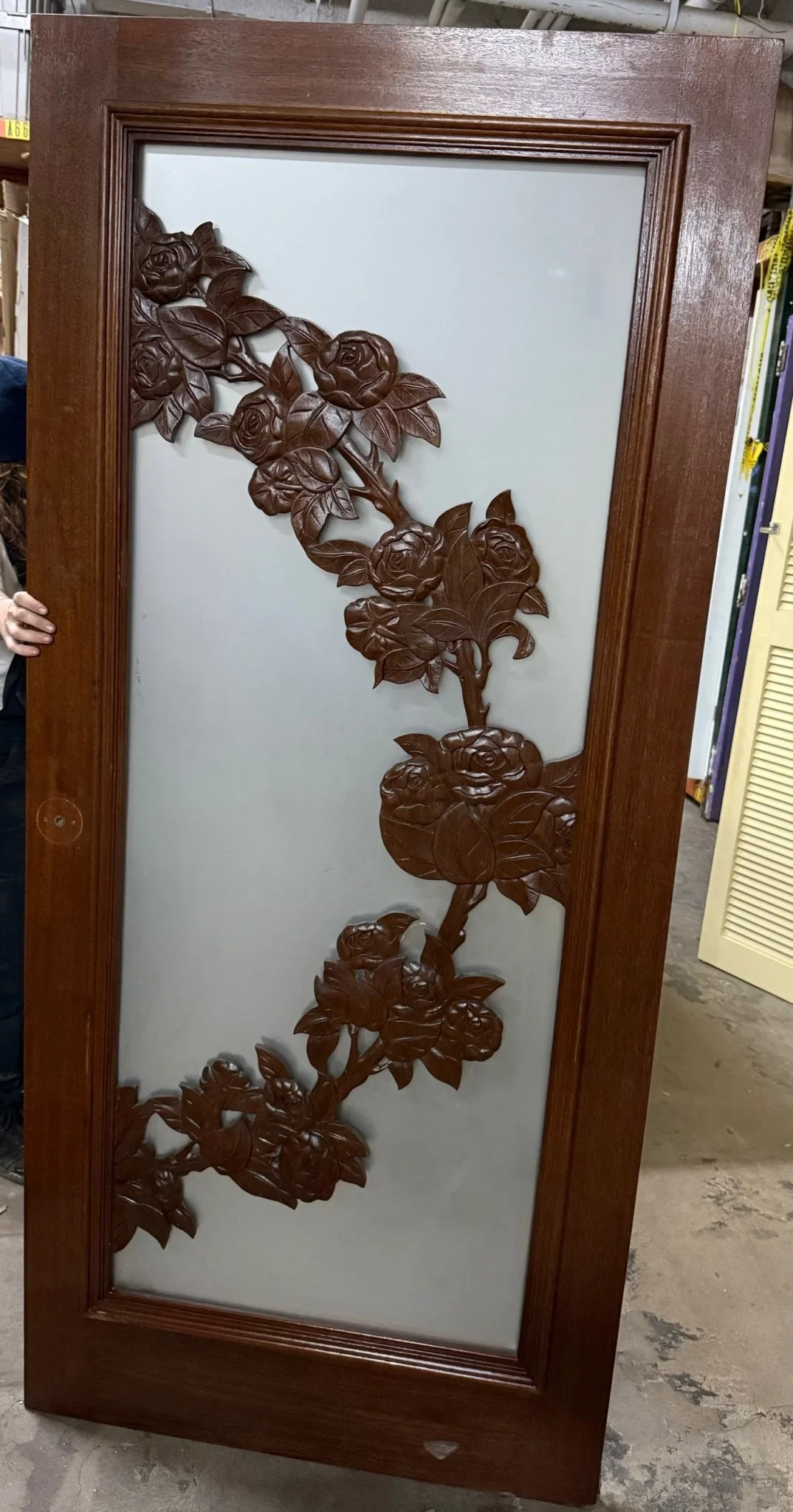 Frosted glass panel with beautiful carved flowers on both sides of both doors. Dark stained hardwood.