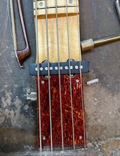 Ministar Basstar 5. This is a 5 string bass, ergonomic for convenience while practicing. Comes with its case!