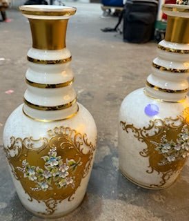 Pair of ornate French provincial/ art nouveau, Moser decanter. Bohemian Moser art glass enameled gilt gold opaline. These are large they stand at 28" tall