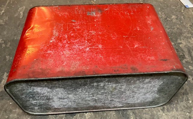 Normal wear and tear for a 65+ year old cooler. Scratches, small dents, little pockets of rust, and yellow paint ring on top. All can be seen in photos.