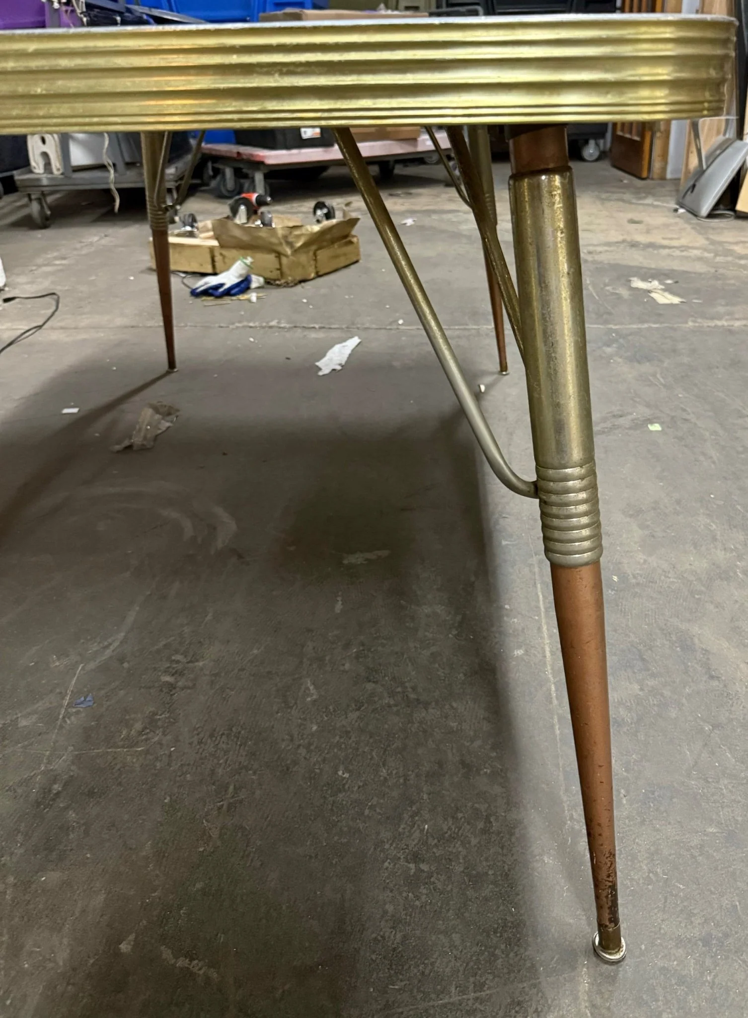 White Formica table with beautiful gold flower design in each of the corners. Trim is a gold chrome metal color.